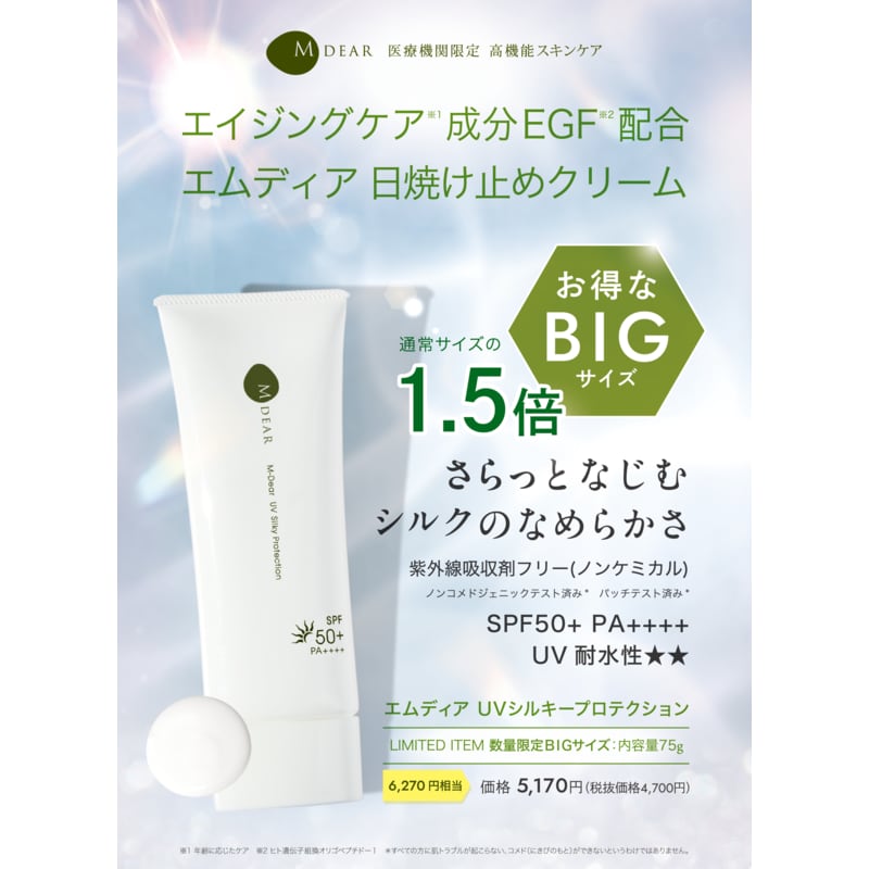 医療機関専売エイジングケア※1化粧品「M-Dear(エムディア)」から、人気の日焼け止めクリーム「エムディア UVシルキープロテクション」が1.5倍の75gサイズで数量限定発売。